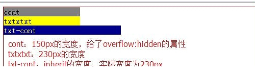.wrap{ position: relative; width: 500px; height: 300px; border: 1px solid red; } .cont{ background: gray; width: 150px; overflow: hidden; } .txt{ background: yellow; width: 230px; height: inherit; } .banner{ background: pink; width: 50%; height: inherit; } .txt-cont{ position: absolute; background: darkblue; width: inherit; color: white; }